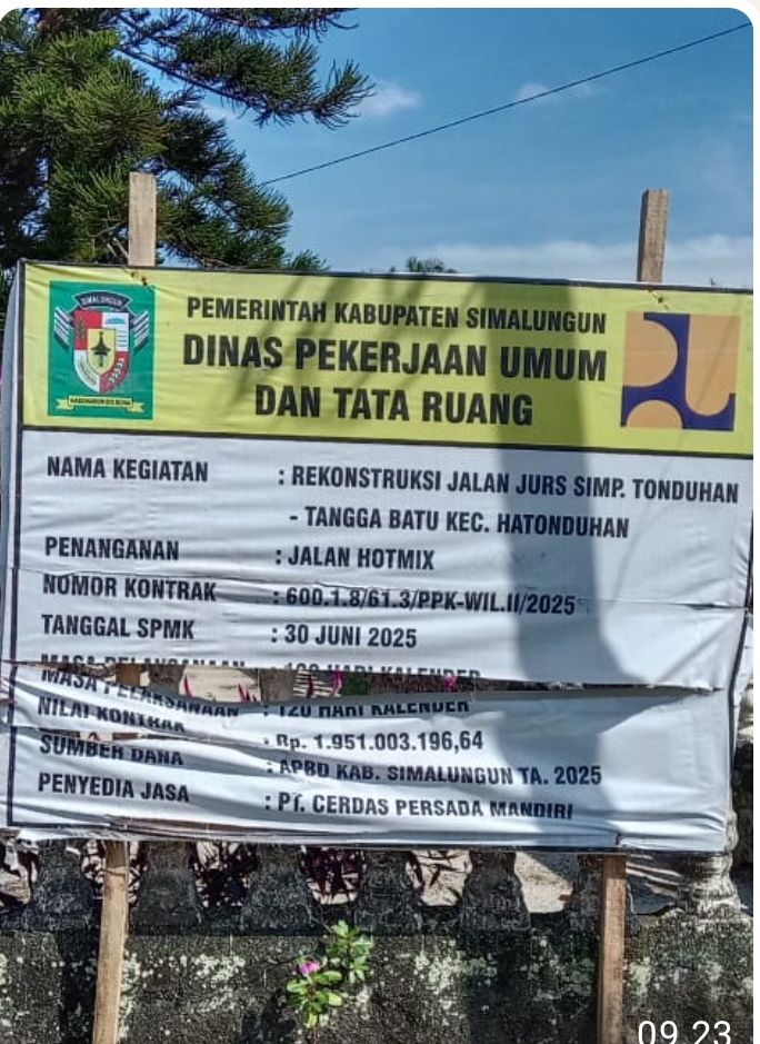 Proyek jalan kabupaten sepanjang 700 meter di Kecamatan Hatonduhan, Kabupaten Simalungun. Dinilai tidak memenuhi standard pembangunan jalan raya.